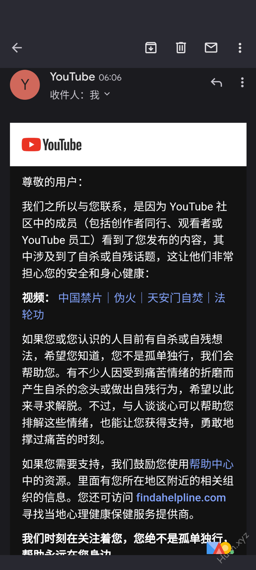 在YouTube转发上传了一些中国禁片,因为涉及到自焚关键词,YouTube官方居然亲切的发来邮件,附带了深圳的一些心理热线电话😂