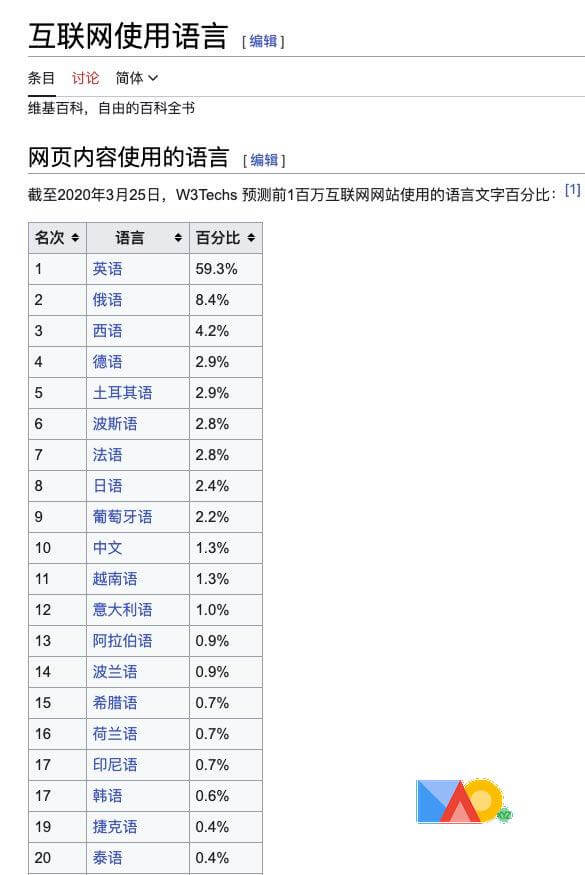 排名前100万的网站使用的语言中,中国汉字占1.3%,日本文字占2.4%。世界上使用汉语的人有11.2亿,日语的有1.2亿。