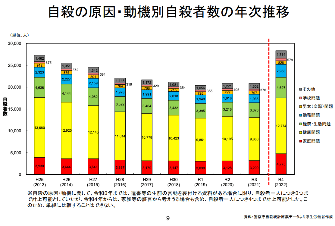 日本2022年自杀的人大概21000多人,和过去5年大概持平。男性的比例是女性的两倍。自杀一般是因为健康问题,其次是家庭和经济原因。一半是无工作者。年龄段分布比较平均。