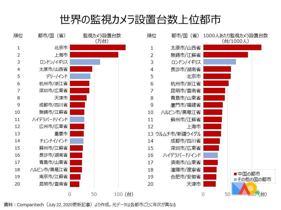 世界上监视摄像头最多的20座城市,其中中国占16个,印度3个。人均摄像头数最多的是山西太原。