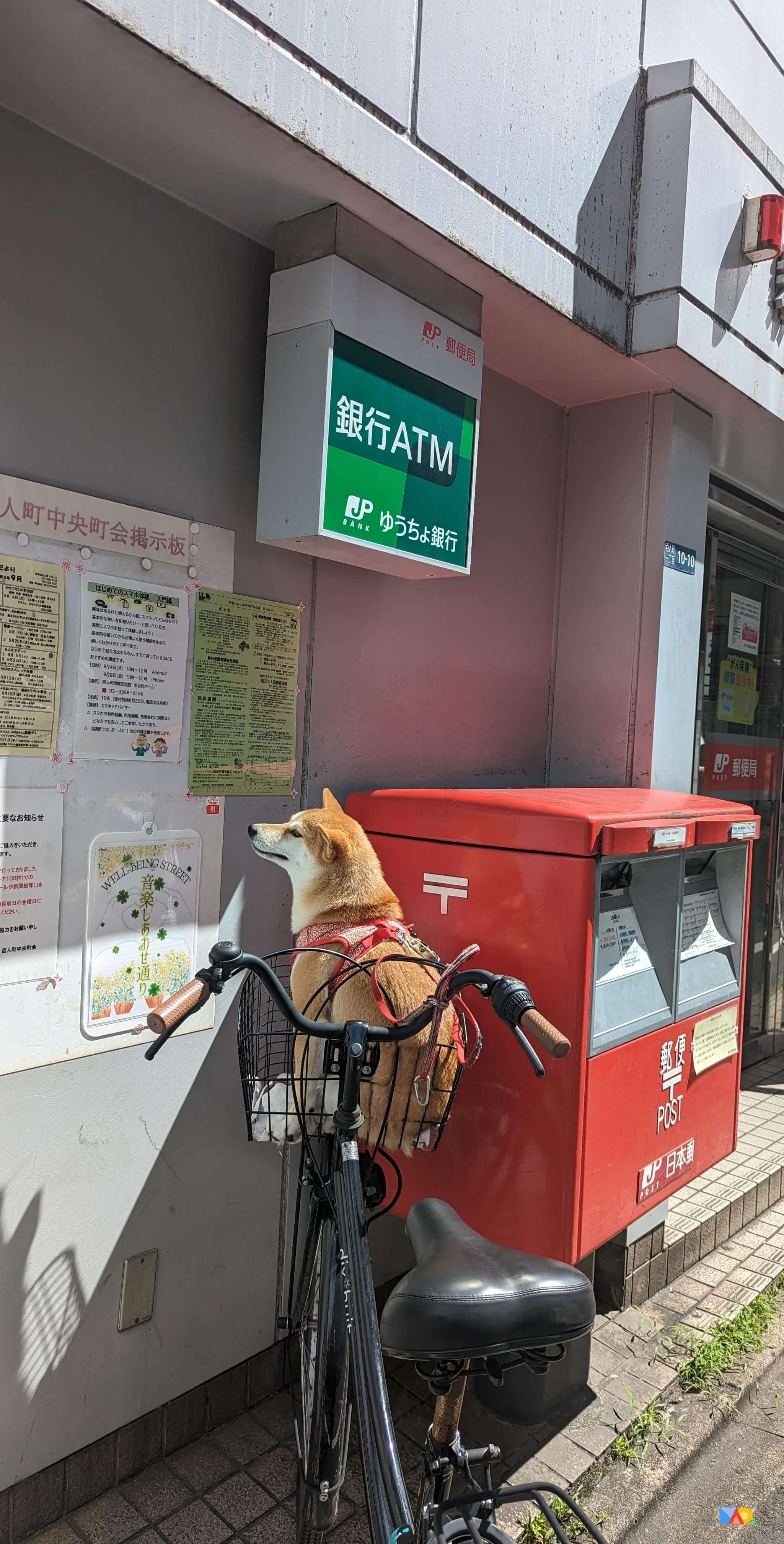 又见一只被主人晾在邮局外面车篮子里被路人观光拍照一脸不情愿的小柴犬。