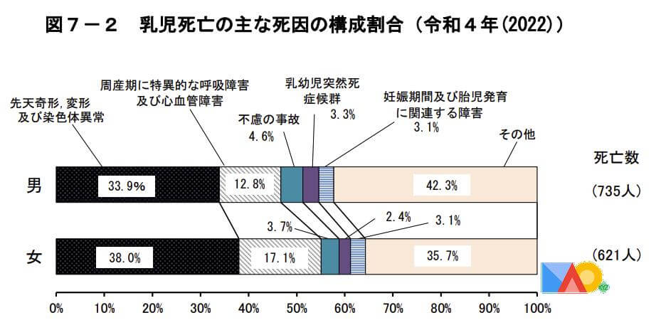 日本では、41秒ごとに1人が生まれ、20秒ごとに1人が亡くなる。 出生率最も高いのは沖縄県。 主な死因は悪性腫瘍。 赤ちゃんの主な死因は先天奇形,変形及び染色体異常。