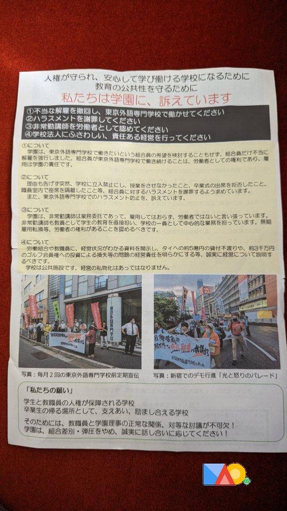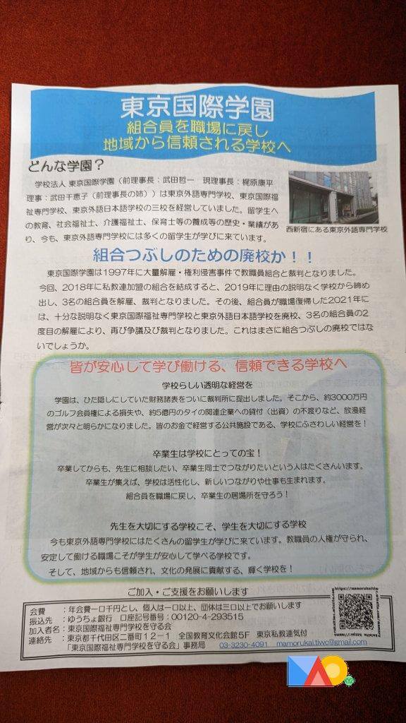東京国際学園(東京外語専門学校、東京国際福祉専門学校、東京外語日本語学校)は2021年に後ろの2つの学校を閉校し、理由もなく職員を無断で解雇したそうだ。