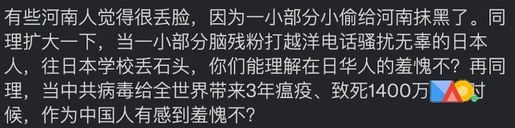 南阳迷笛事件 VS 反日核废水事件 -音乐人🎸:传闻河南人偷东西,我不信 -日本人🇯🇵:听说中国人脑残粉,我不信 -河南偷盗大法🤏:偷你帐篷偷你音箱偷你内裤 -社会主义铁拳👊:骚扰电话呼死你石头砸死你 -音乐人🎸:以后不来了😭 -日本人🇯🇵:降参した!🏳️