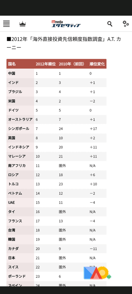 海外投資先信頼度ランキング