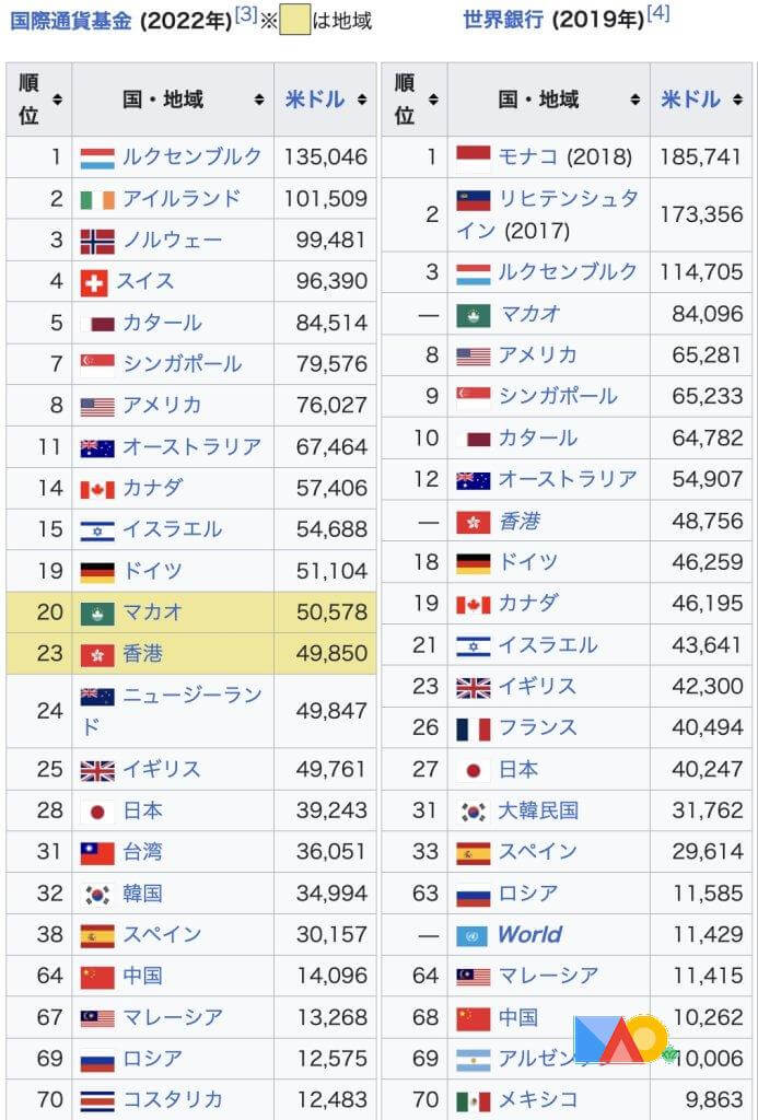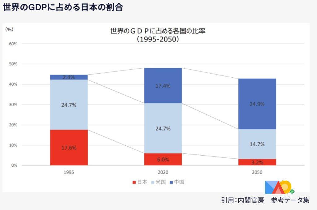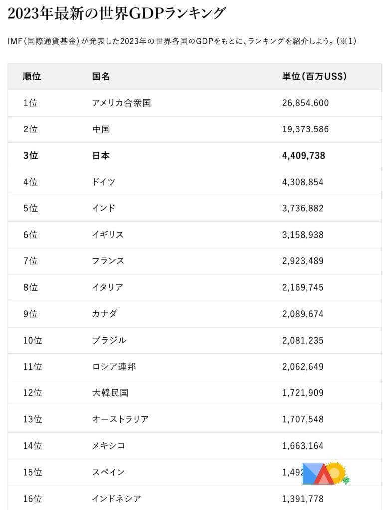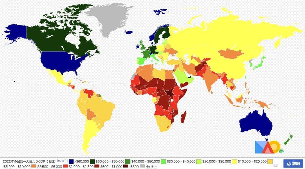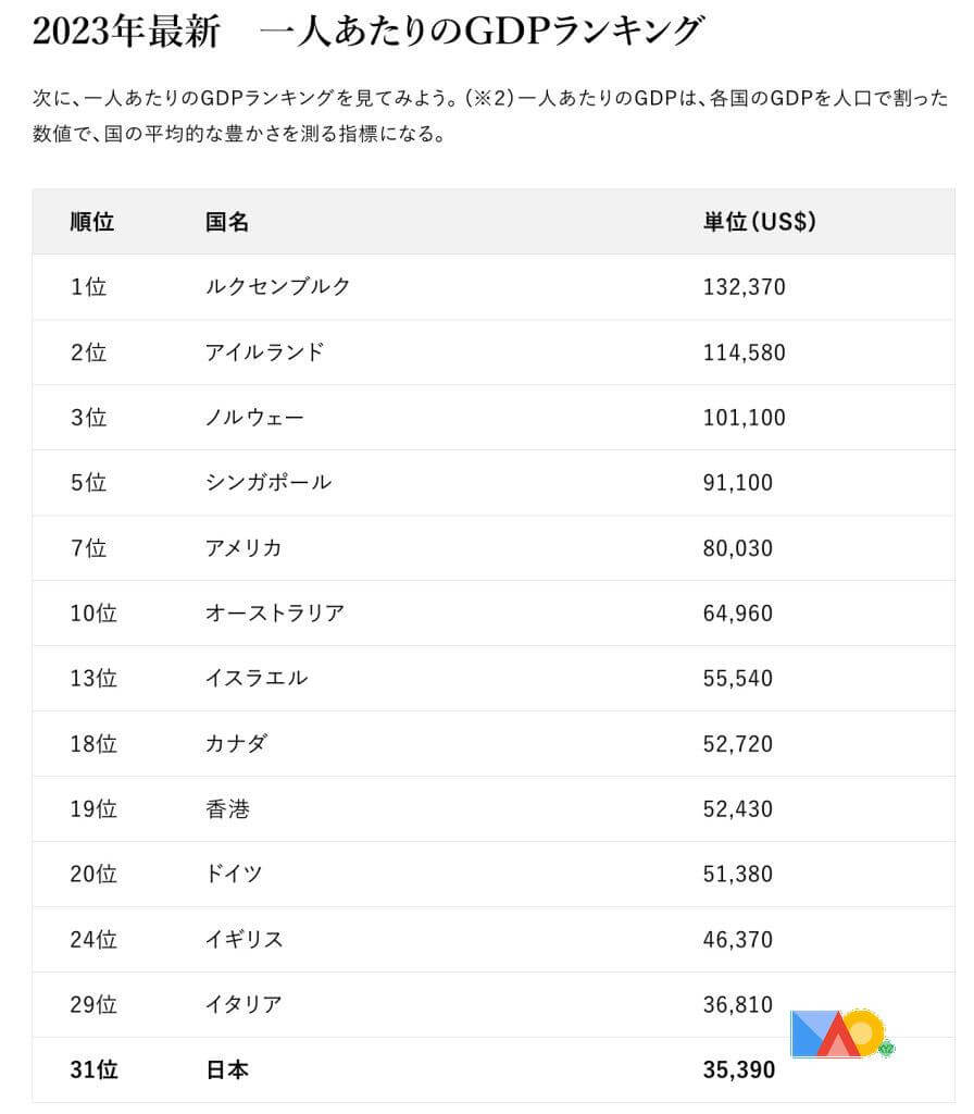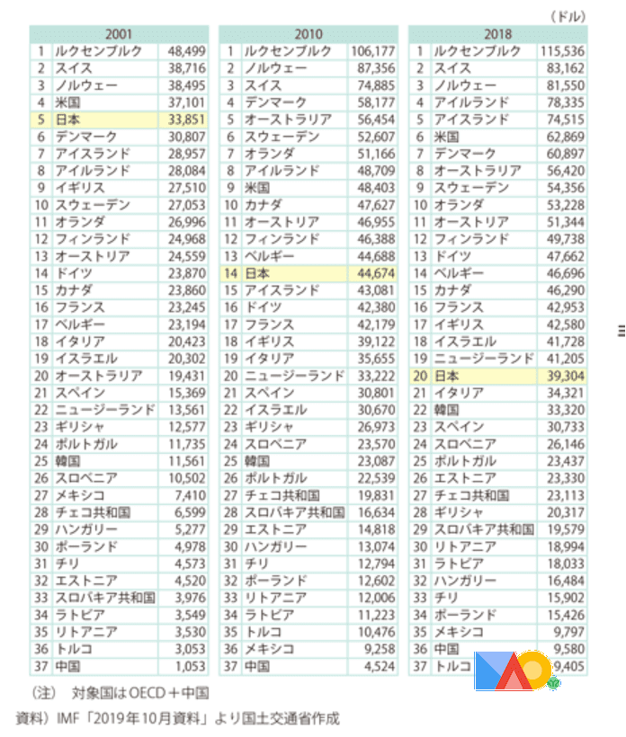 日本の一人当たりのGDPランキング 2001年 第5位 2010年 第14位 2018年 第20位 2023年 第31位 日本は先進国のグループから外されるかも