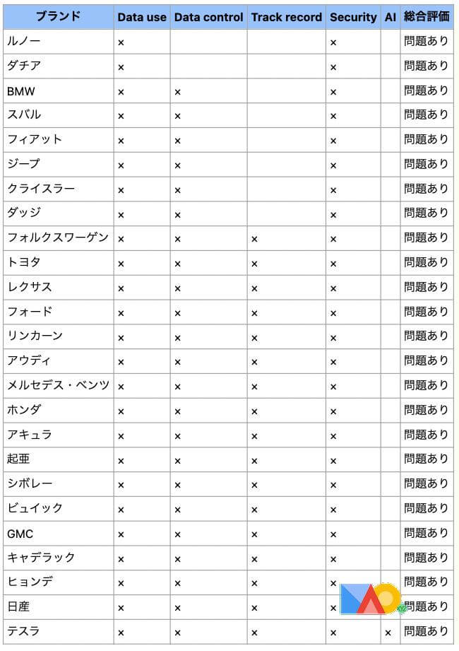 非営利団体のMozilla Foundationが自動車の主要25ブランドのプライバシーポリシーを調査した結果、84%の自動車ブランドが「個人情報を他社と共有できる」と明言し、76%の自動車ブランドは「個人情報を他社に販売できる」と明言していることが明らかになりました 「個人情報の使用状況(Data use)」 「ユーザーが個人情報の収集をコントロールできるか(Data control)」 「個人情報が適切に保護されるか(Track record)」 「製品がセキュリティ基準を満たしているか(Security)」 「個人情報がAIの学習に使われるか(AI)」