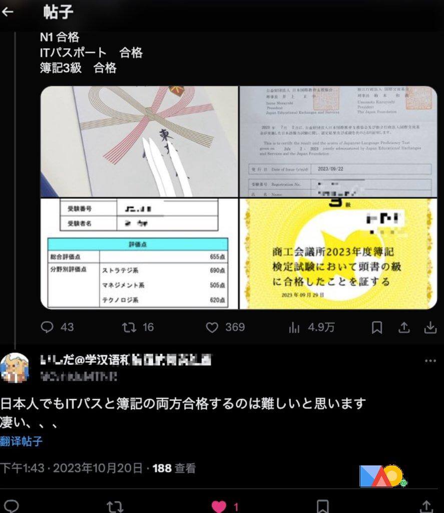 我这一年获得的全勤和证书在推上得到369个赞,很多日本人转发并成为了我的粉丝。有个中国女婿留言说凭这份努力就想给我一份工作🎊