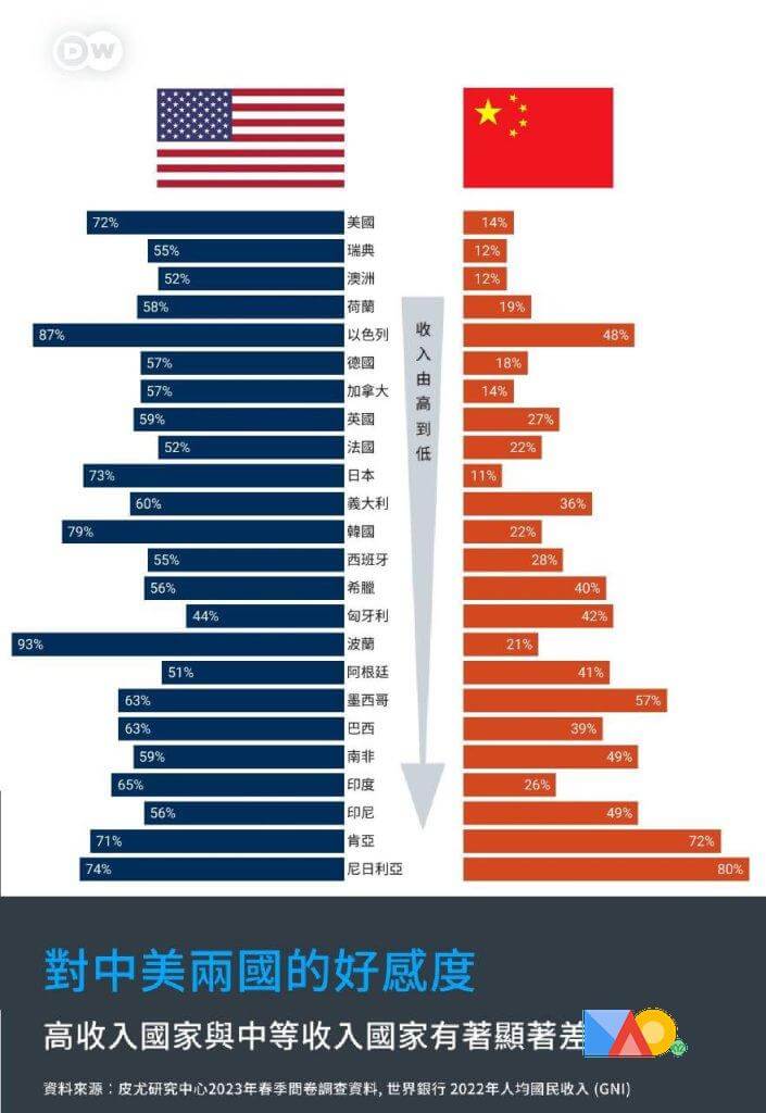 各国が中米両国への好感度ランキング (上から下へ、国民の収入が高い順) 国民の収入と中国への好感度は全体的に逆比例している