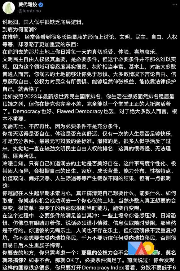最初は本当に日本の文明と自由に惹かれてきたが、徐々に第二の人生をスタートしたように感じ、まるで迷子の犬が自分の家を見つけたようだった。中国ではただ生きていたと言うより、日本では生活を味わったと感じている。中国の政治に代わり、足元のこの土地の生活に興味を持つようになった。よく空を仰ぎ、花の香りを嗅ぎ、街で出会った鳩や猫犬に微笑みかけている。十数年ぶりに寄付を始め、親切な知らぬ人に癒やされ、人のために小さな善行を多く行った。歩みがゆっくりになり、心が緩んでいる。これが日本で実際に体験したものだった。日本、ありがとう。
