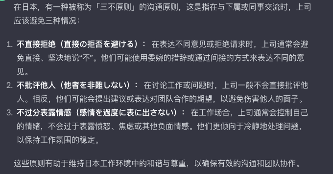日本上司の「三不原則」: 1、直接的な批判を避ける 2、社員を仲間外れにさせないように 3、残業の示唆を避ける