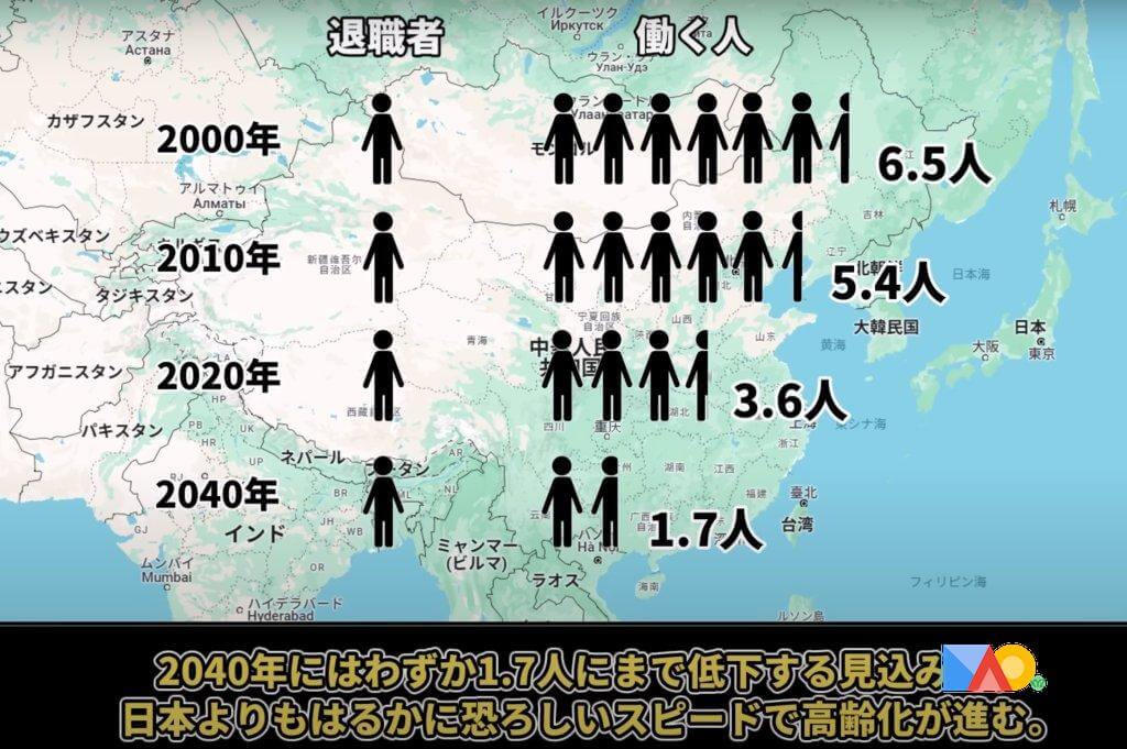 2040年には中国で退職者1人当たり働く人が1.7人にまで減少すると予想され、日本よりも速く少子高齢化が進んでいます。しかし、先進国である日本と異なり、中国はまだ十分に豊かになる前に老齢化社会に突入し、いわゆる「未富先老」の社会になっています。