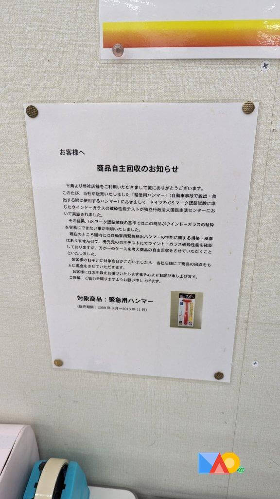 4年間販売された非常用窓割りハンマーのリコール通知。