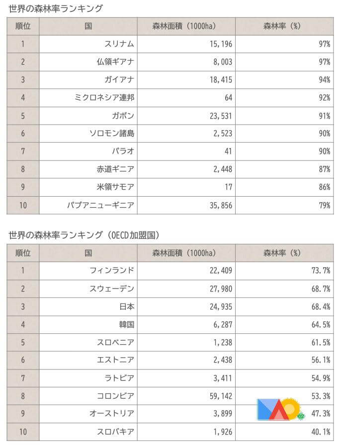 各国の森林率ランキング 森林率は、その国やエリアにおける森林の豊かさを表す指標となる。 日本の森林率は66%で世界平均(27.6%)を大きく上回り、先進国の中で第3位で、世界有数の「森の国」といえる。