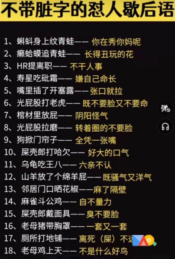 汚い言葉を使わない言い回し 1、オタマジャクシに蛙のタトゥー——天狗になるな 2、イボガエルが蛙を追いかける——ブサイクなのに派手なことするな 3、人事部が辞めるって——人間の事とは思えない 4、長生きする人が毒を飲む——自分の命を嫌がる 5、口に浣腸剤を突っ込んでる——口を開けると下ネタ 6、裸で虎と戦う——恥知らずで命知らず 7、棺桶の中で屁をこく——嫌味なこと言うな 8、裸で臼を回す——恥知らずにずるずる回る 9、犬が戸を開ける——口だけの奴 10、フンコロガシあくびをする——大口を叩くな 11、カメがスッポンを食べる——血も涙もない奴 12、ヤギが羊の屁をこく——臭くてオシャレ 13、隣の家の前で山椒を干す——くそ! 14、スズメが鶏と戦う——身の程知らず 15、フンコロガシがマスクをつける——臭いを隠せない恥知らず 16、雌豚がブラジャーをつける——二転三転するな 17、トイレで寝てる——死が近づいた 18、雌鶏が天に昇る——ろくでもない奴