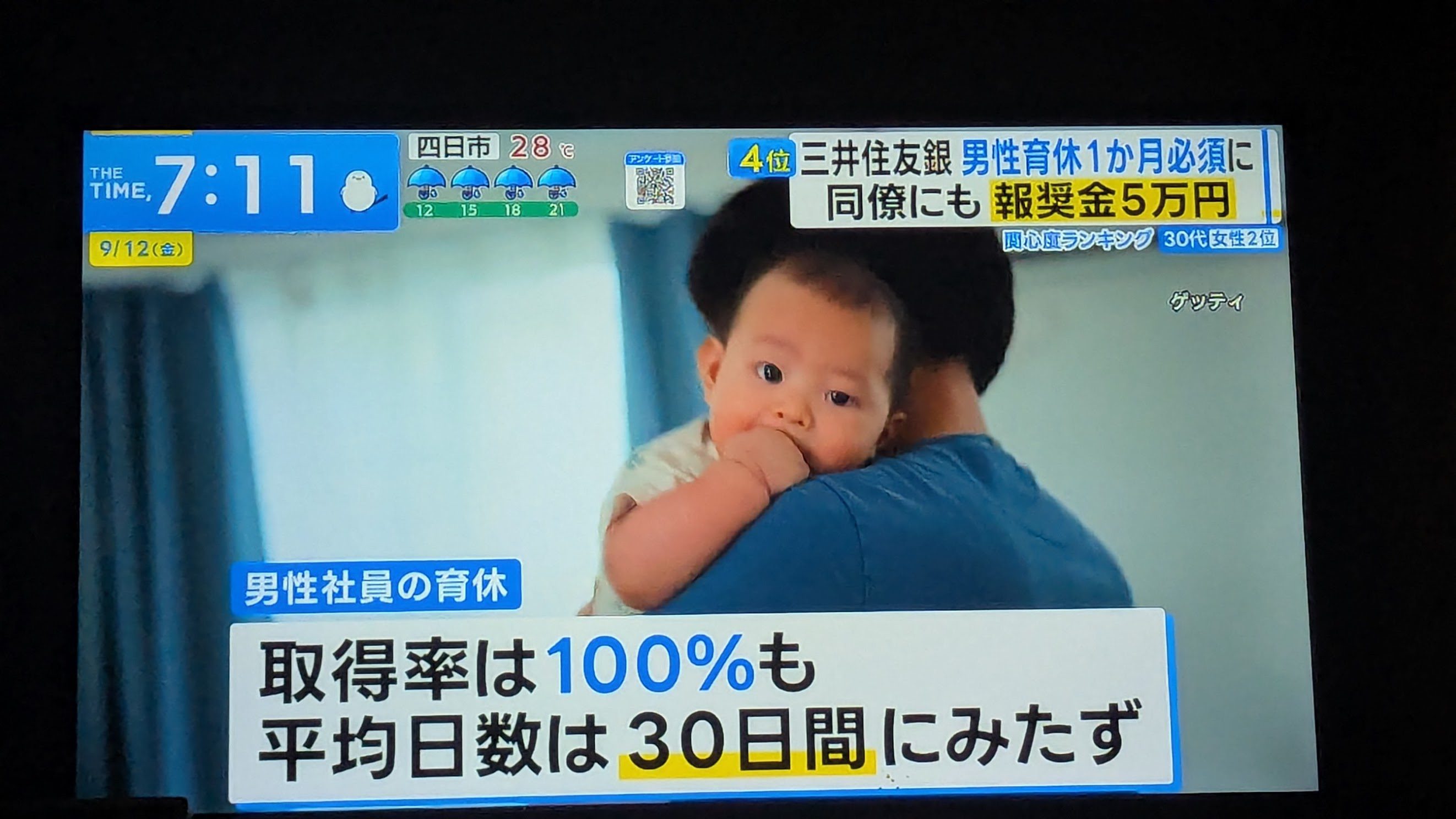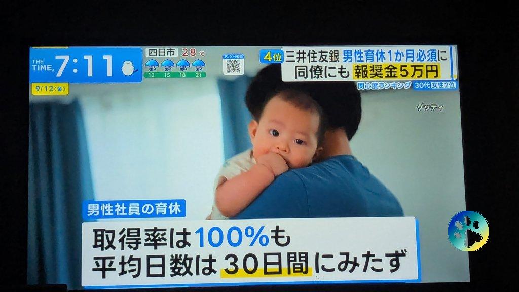 三井住友銀行は、男性に30日間の育休取得を義務づけ、同僚最大20人に各5万円のボーナスが出る。 中国では、女の人の15.8%は産休を全く取らず、35.1%は98日も取れてないんだって。男の人も7〜30日の産休があるはずなのに、41.78%は一度も取ってなくて、休んだらクビになったなんて話もあるらしい。