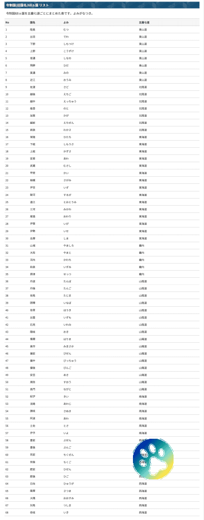 五畿七道(ごきしちどう)の六十八国 令制国(旧国名)一覧 https://www.start-point.net/syakai/ryouseikoku_list/