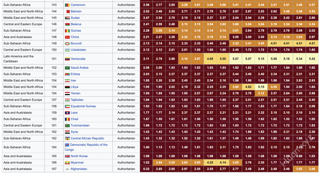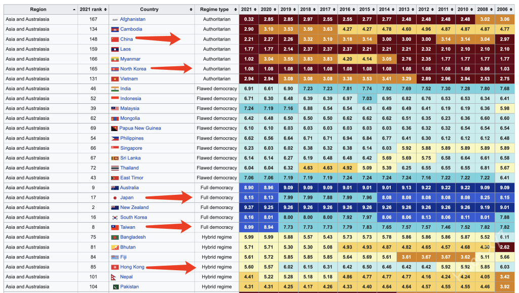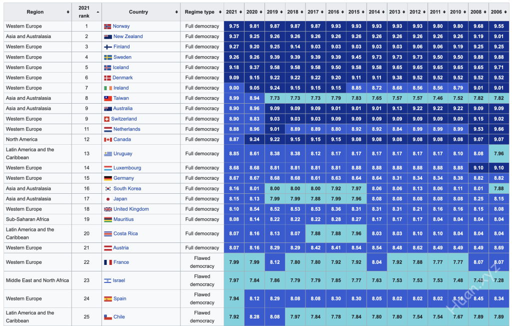 2021年民主指数ランキング https://en.wikipedia.org/wiki/Democracy_Index