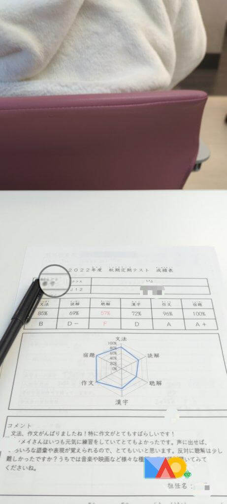 一学期の成績表が出ました!👏 聴解の点数は一番低いですが、出国前よりもかなり進歩しました。🚀 先生達に感謝の気持ちでいっぱいです!❤️ これからも頑張っていきます!💪