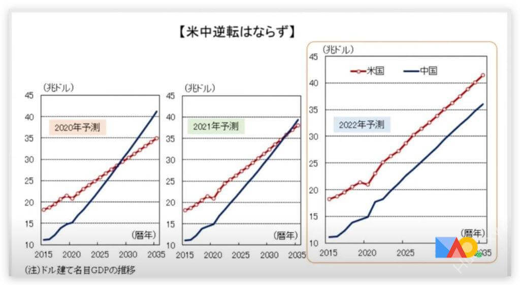 日本経済研究センター 過去3年間にわたって中国がアメリカを超える時期を予測したグラフ