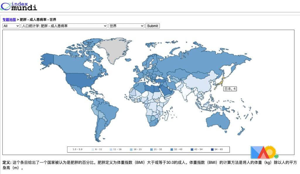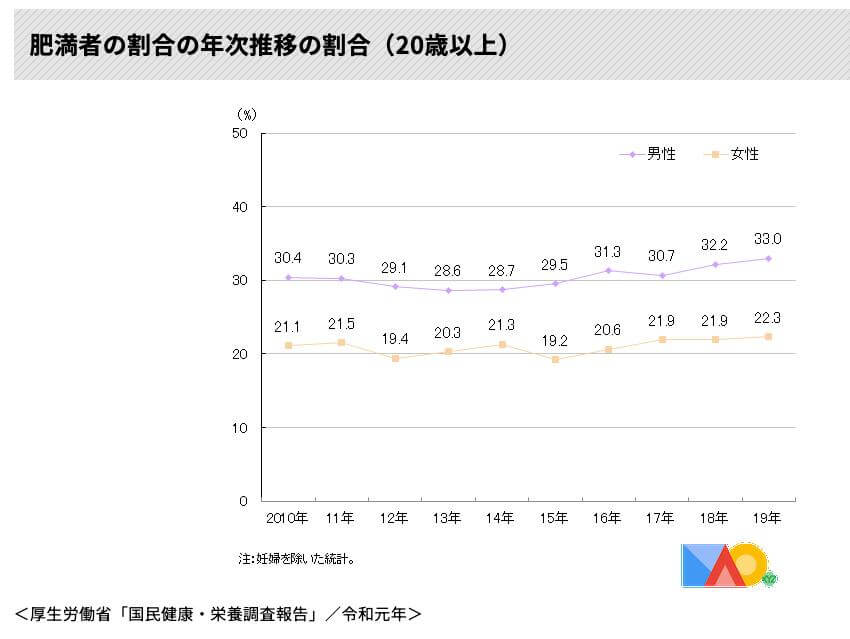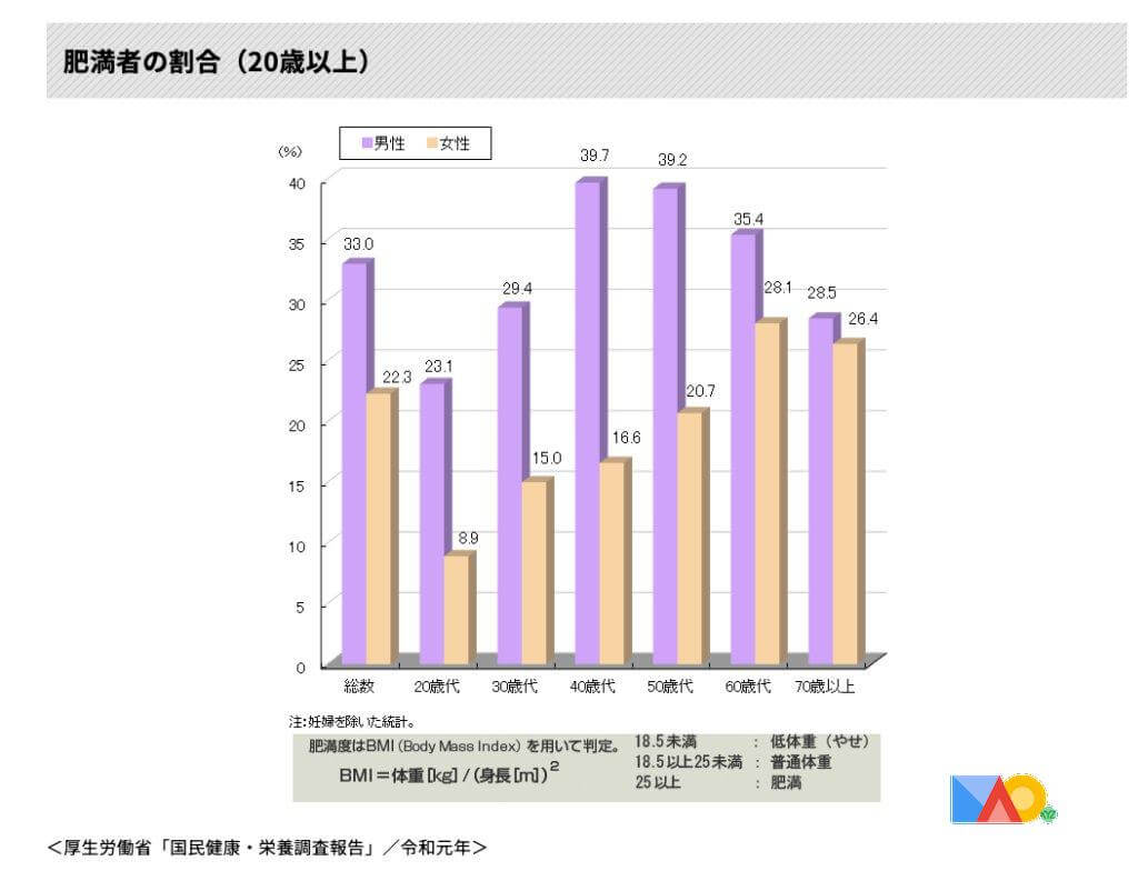 日本では、男性は約3割、女性は約2割が肥満(BMIが25以上の人) 世界的には日本の肥満率はとても低い。 https://www.indexmundi.com/g/r.aspx?t=0&v=2228&l=zh
