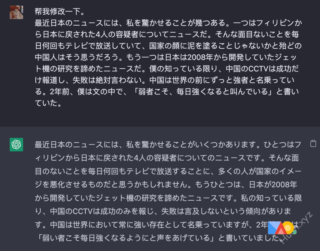 最近日本のニュースには、私を驚かせることがいくつかあります。ひとつはフィリピンから日本に戻された4人の容疑者についてのニュースです。そんな面目のないことを毎日何回もテレビで放送することに、多くの人が国家のイメージを悪化させるものだと思うかもしれません。もうひとつは、日本が2008年から開発していたジェット機の研究を諦めたニュースです。私の知っている限り、中国のCCTVは成功のみを報じ、失敗は言及しないという傾向があります。中国は世界において常に強い存在として名乗っていますが、2年前、私は「弱い者こそ毎日強くなるようにと声をあげている」と書いていました。