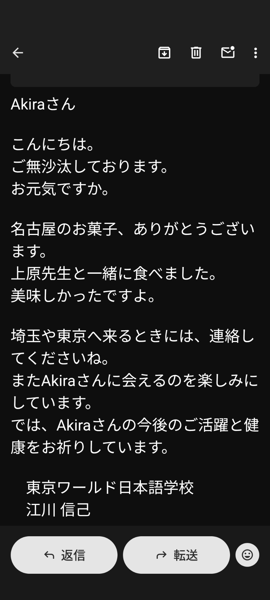 先週、先輩と先生に送ったお土産が無事に届いたみたい✌ 悩んでるけど、先生のメールって返信すべきかな? 普通「楽しみ……」って来たら返すべきなんだけど、 その後に「ご活躍と健康……」って書いてあって…締めの挨拶っぽくて、返すか迷うんだ。 日本語、むずかしすぎる😭 念のため、返信した😅